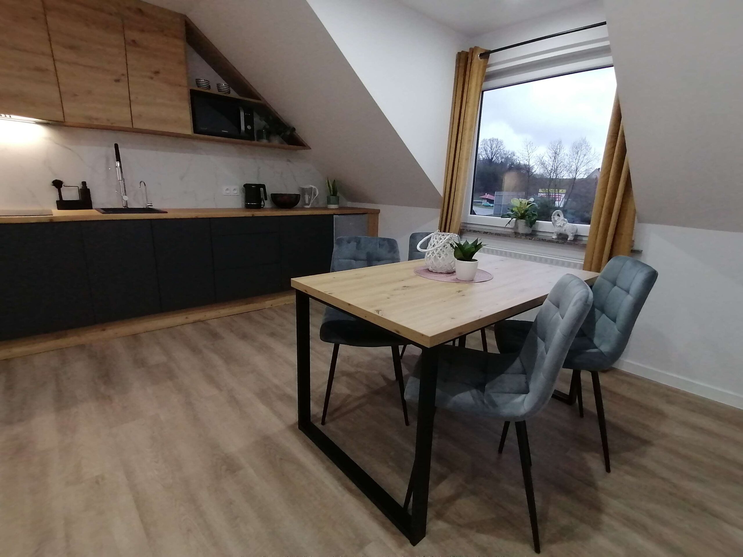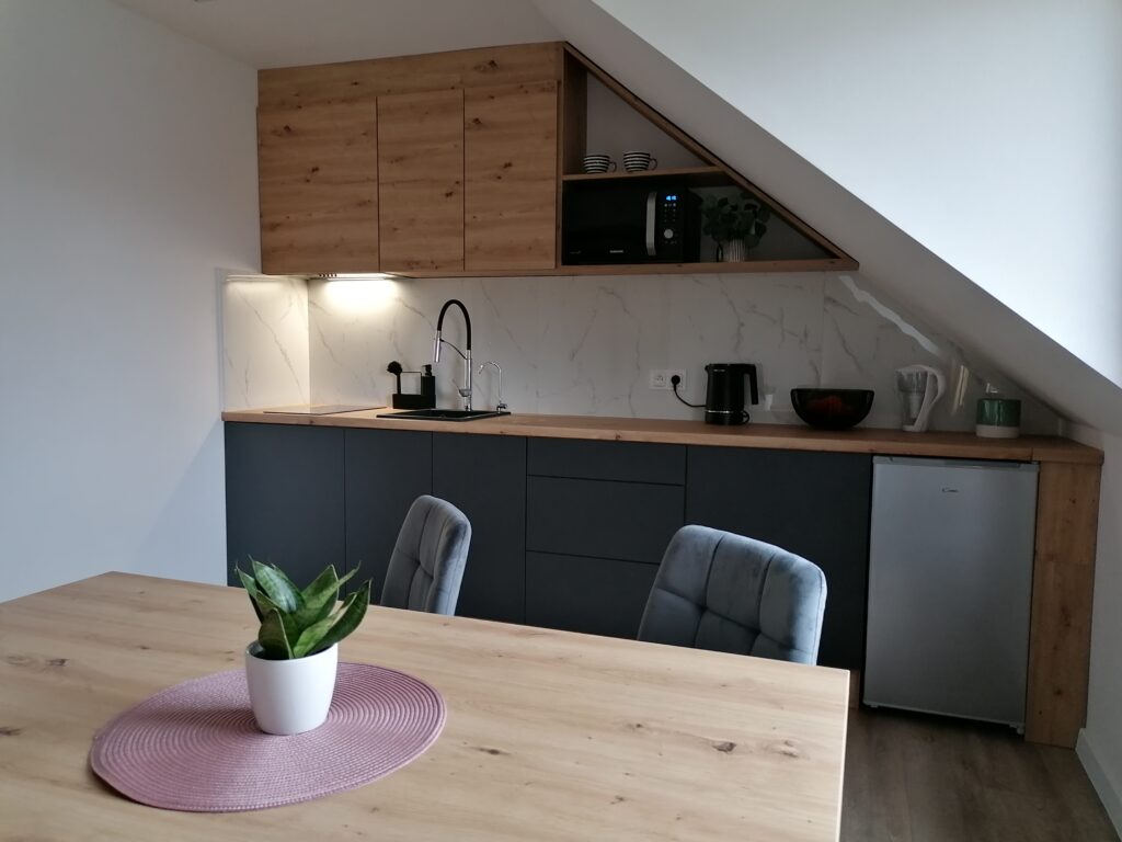 Oferujemy przytulny apartament z przestronna jadalnią oraz kuchnią z pełnym wyposażeniem i wodę filtrowaną.